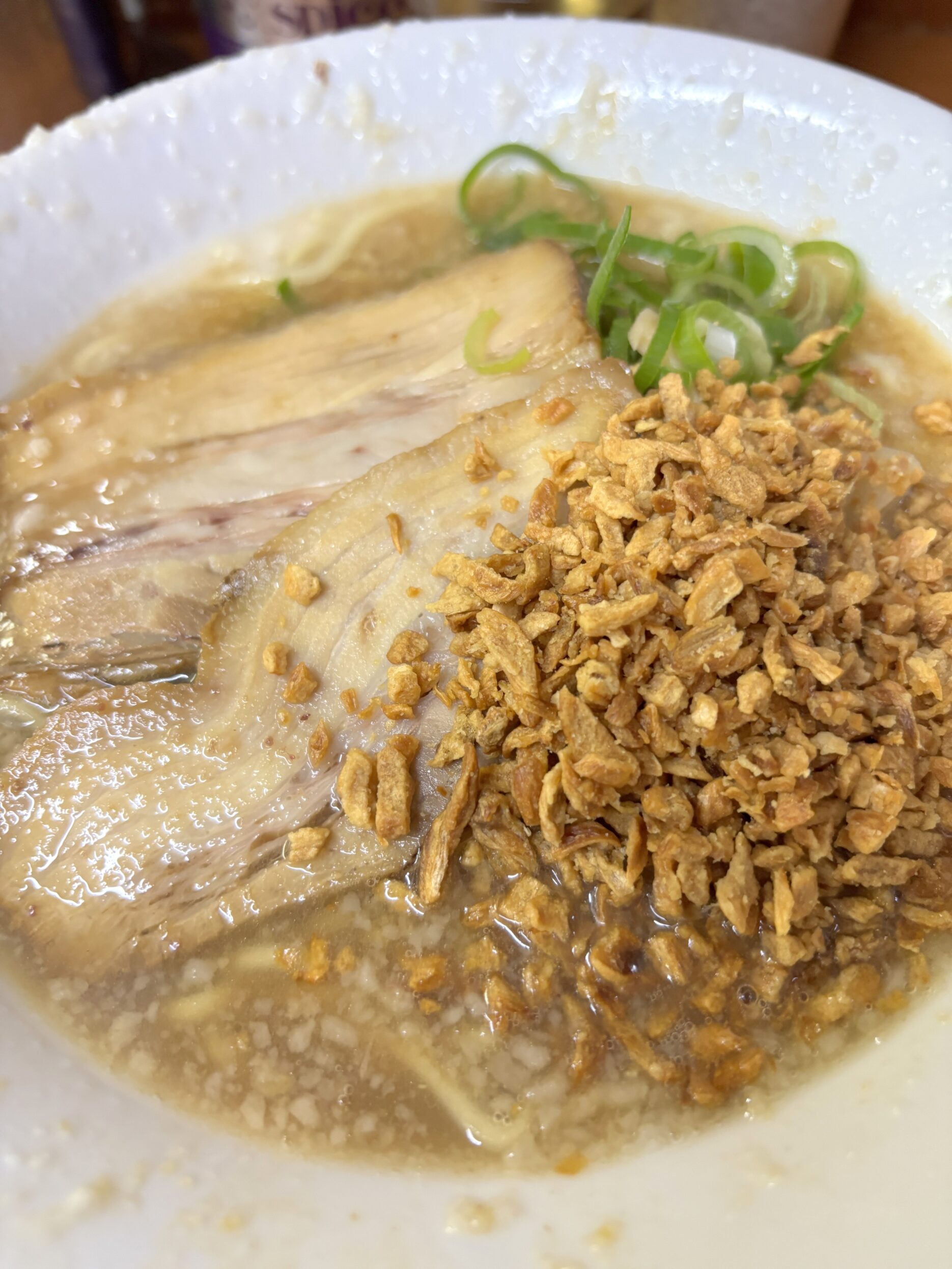 脂の甘さ、豚骨の濃さ、よく絡むコシのある麺、そして背徳感満点のガーリックフライ。すべてが融合しておいしさになる不思議。