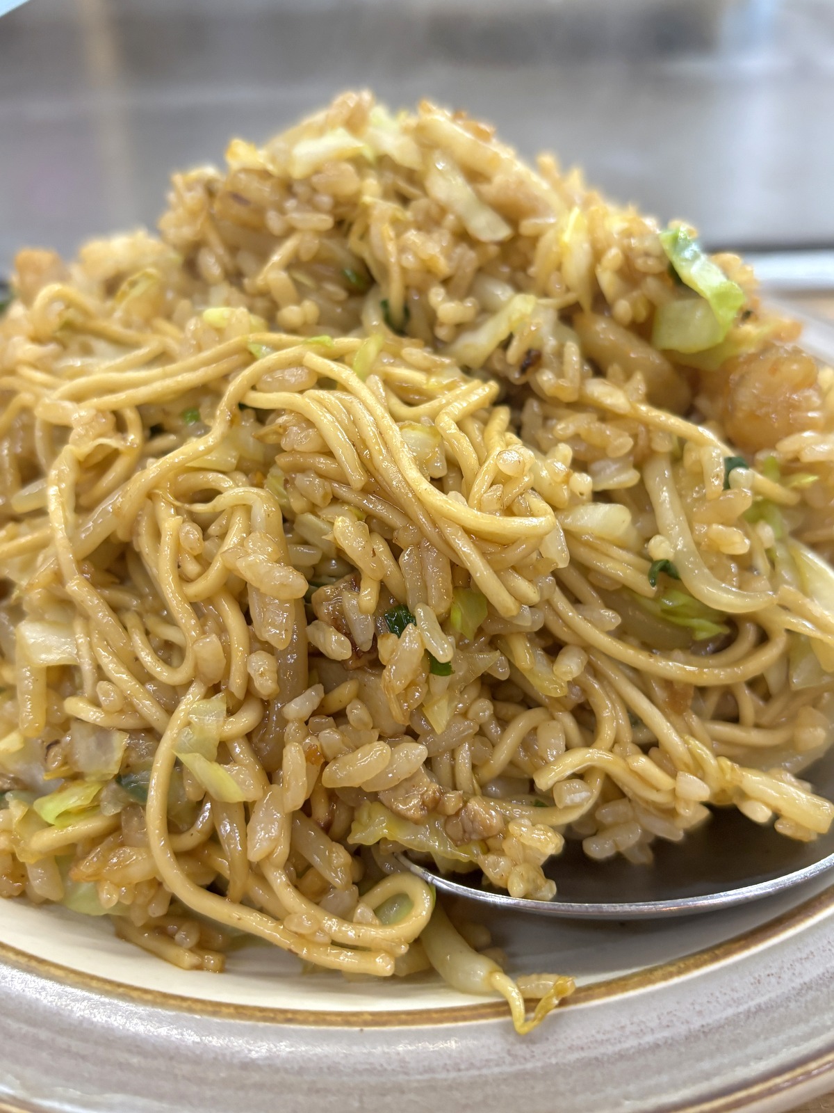 カウンターに座り、そばめし(メニューでは「ちゃんぽん」、1250円)を注文。かなり量が多いので覚悟を決める😁